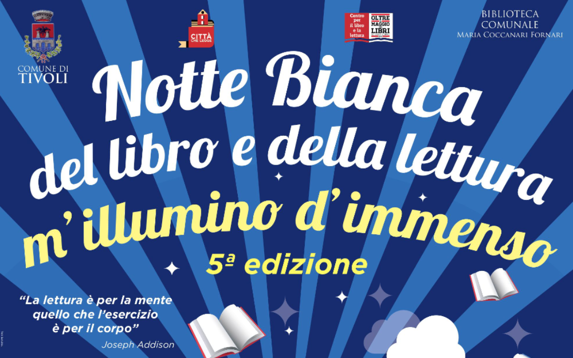 Venerdì 31 luglio torna la “Notte bianca del libro e della lettura – m’illumino d’immenso’”, quinta edizione dell’iniziativa dedicata alla lettura, alla riflessione letteraria e allo scambio gratuito dei libri, organizzata dal settore ‘Politiche per la promozione della lettura’ e proposta dalla consigliera del sindaco Rosa Mininno.