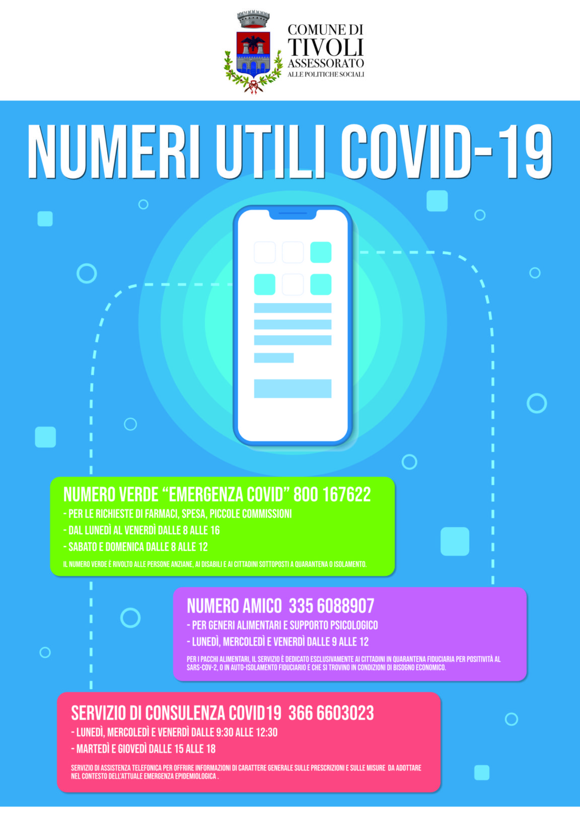 Il Comune di Tivoli potenzia i servizi a supporto dei cittadini in condizioni di bisogno a causa dell’emergenza sanitaria da Covid19. A partire da lunedì 16 novembre, infatti, il settore Welfare del Comune di Tivoli incrementa i numeri di telefono a disposizione della cittadinanza, per meglio rispondere alle diverse esigenze che le persone stanno vivendo in questa fase di recrudescenza del contagio nel territorio tiburtino.