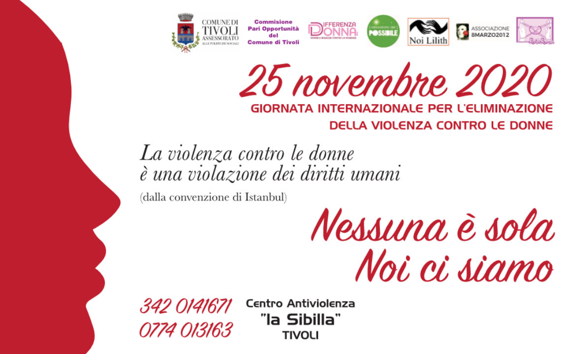 L’assessorato alle Politiche sociali del Comune di Tivoli, la commissione Pari opportunità del Comune di Tivoli, le associazioni “Differenza donna”, “Il laboratorio del possibile”, “Noi Lilith”, “8marzo2012” e “Rete Rosa” ricordano insieme con una locandina che riunisce la loro voce, che la violenza contro le donne è un crimine contro l’umanità, è una violazione dei diritti umani, una limitazione del diritto alla libera autodeterminazione delle donne. Violenze che non sono soltanto fisiche, ma anche mentali, psicologiche, virtuali e che devono essere combattute con un’arma potentissima: la cultura dell’emancipazione.