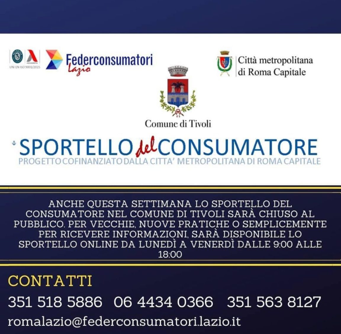 Lo sportello del consumatore, progetto cofinanziato dalla città metropolitana di Roma Capitale, informa che lo sportello di Tivoli anche questa settimana sarà chiuso al pubblico. Per vecchie e nuove pratiche, o semplicemente per ricevere informazioni, sarà disponibile lo sportello online dal lunedì al venerdì, dalle 9 alle 18.