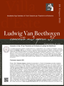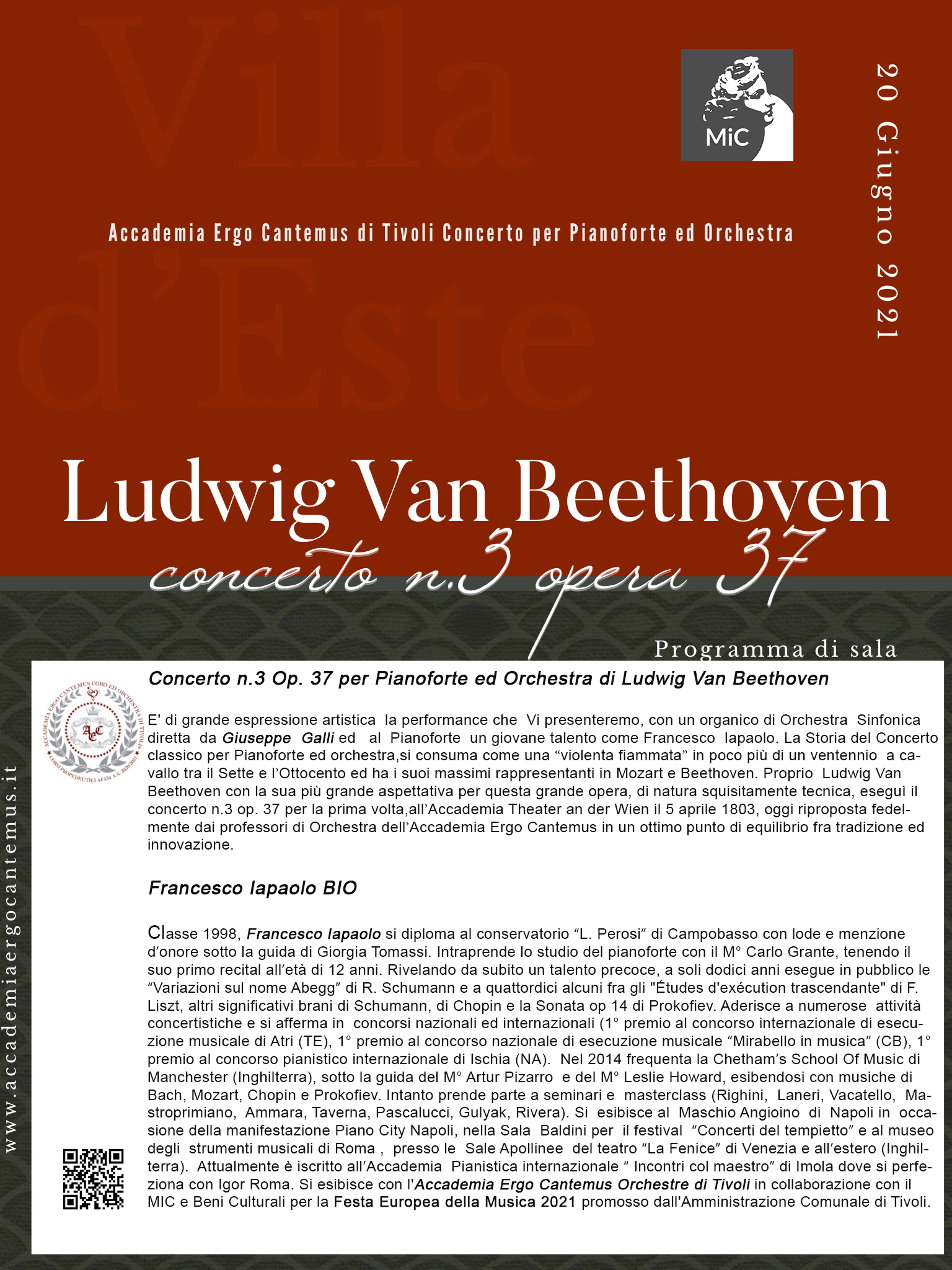 L’istituto Villa Adriana e Villa d’Este–VILLAE, Ministero della Cultura, in collaborazione con l’Assessorato alla Cultura del Comune di Tivoli, prosegue i festeggiamenti per la Festa Europea della Musica 2021, un avvenimento internazionale, uno dei simboli dell’unione culturale tra i Paesi e i popoli. Villa d’Este, sito Unesco, organismo vivente di composizioni architettoniche e vegetali, rappresenta la summa delle caratteristiche di un intero territorio, immersa nella storia millenaria di Tivoli, e conserva pressoché intatto, un patrimonio culturale, paesaggistico, storico e naturalistico di rara bellezza. In questo contesto, Accademia Ergo Cantemus Coro e Orchestre Tivoli, nell’ottica della costante e piena valorizzazione del patrimonio culturale, celebrano il principio ispiratore dell’importante Festa, che è quello di fare la Musica, con una rinnovata Call Culturale, uno spazio di stimoli e creatività che faciliti professori e allievi giovani della Musica, ad esprimere e realizzare nuove progettualità con sperimentazioni dirette. Un concerto di grande espressione artistica quello presentato, con un organico di Orchestra Sinfonica diretta da Giuseppe Galli e al Pianoforte un giovane talento come Francesco Iapaolo. La Storia del Concerto classico per Pianoforte e orchestra si consuma come una “violenta fiammata” in poco più di un ventennio a cavallo tra il Sette e l’Ottocento e ha i suoi massimi rappresentanti in Mozart e Beethoven. Proprio Ludwig Van Beethoven con la sua più grande aspettativa per questa grande opera, di natura squisitamente tecnica, eseguì il concerto n.3 op. 37 per la prima volta, all’Accademia Theater an derWien il 5 aprile 1803, oggi riproposta fedelmente dai professori di Orchestra dell’Accademia Ergo Cantemus in un ottimo punto di equilibrio fra tradizione e innovazione.