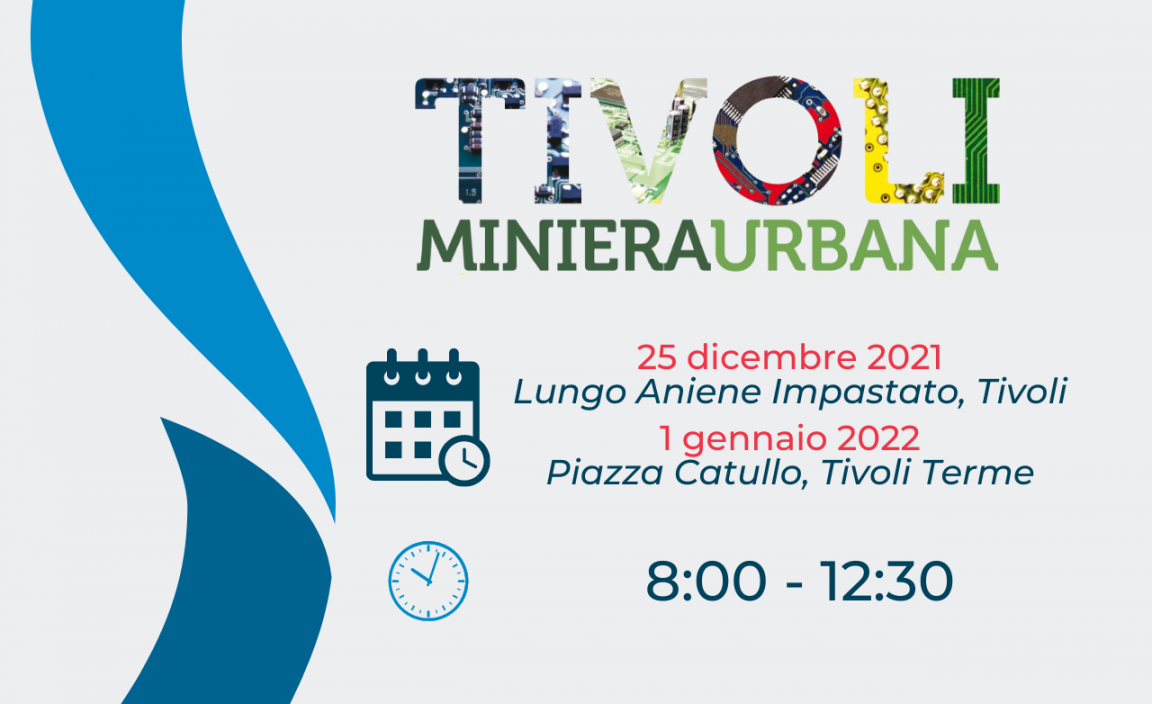 In occasione delle festività natalizie, si comunica che le prossime Miniere Urbane che si terranno il 25 dicembre 2021 a Tivoli, Lungo Aniene Impastato e il 1 gennaio 2022 a Tivoli Terme, Piazza Catullo: