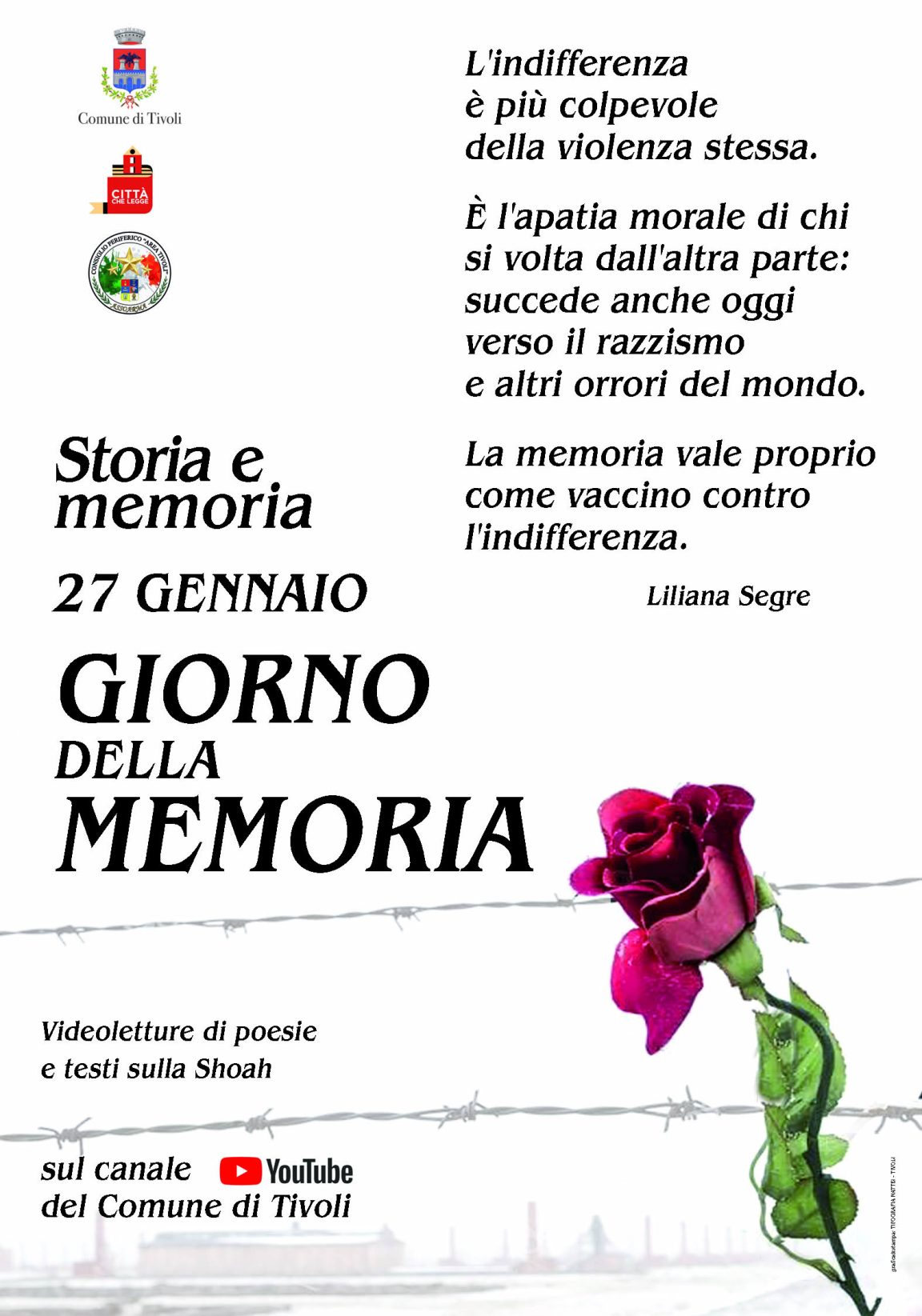 Per non disperdere il ricordo di un evento tanto tragico quanto significativo per la storia dell’umanità, la consigliera incaricata dal sindaco per la lettura, Rosa Mininno, ha invitato i sottoscrittori del “Patto di Tivoli per la lettura”, autori, poeti del territorio tiburtino, giornalisti, consiglieri comunali, assessori e studenti a inviare un video di una poesia, un brano o una testimonianza recitati e riferiti al Giorno della Memoria.
