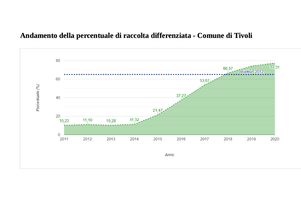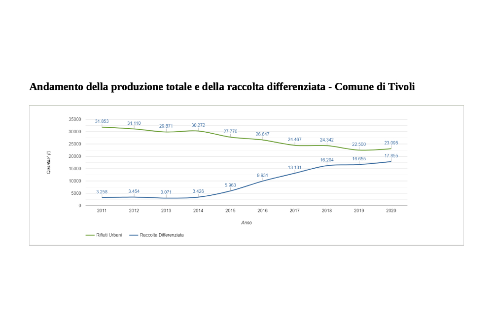 Sul sito del Catasto Nazionale dei Rifiuti dell’Ispra è anche possibile consultare nel dettaglio i dati relativi al comune di Tivoli nell’arco temporale che va dal 2010 al 2020. Si parte da una percentuale di raccolta differenziata dell’11,04% del 2010: la curva inizia a salire dal 2015, dopo l’insediamento, a giugno del 2014, della giunta Proietti, fino ad arrivare al 77,31% del 2020. Dato interessante, a testimonianza del comportamento virtuoso dei cittadini, è quello relativo alla produzione di rifiuti urbani: mentre nel 2010 la produzione totale di rifiuti urbani era di 31,853 tonnellate, la curva decresce fino ad arrivare a 23,095 tonnellate del 2020. Ciò dimostra che i tiburtini, raccogliendo indicazioni e suggerimenti dell’Amministrazione comunale e della partecipata ASA Tivoli Spa, non solo differenziano i rifiuti, ma ne producono molti meno.