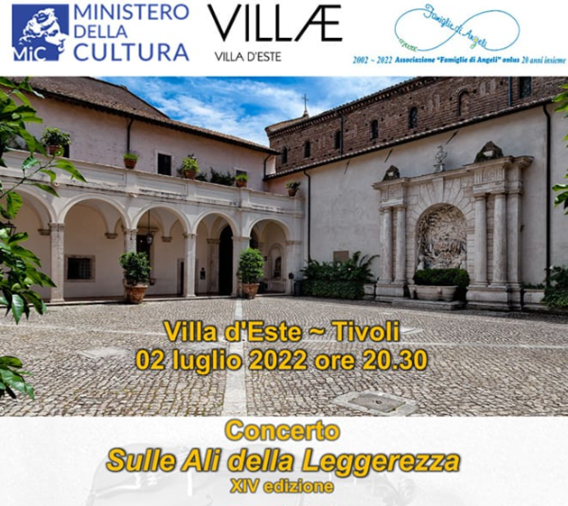 Sabato 2 luglio, alle ore 20.30, nella splendida cornice del Chiostro di Villa d’Este di Tivoli, si terrà il concerto “Sulle ali della leggerezza”, organizzato dall’associazione “Famiglie di Angeli” Onlus, in collaborazione con l’Istituto Villa Adriana e Villa d’Este-VILLAE e con il patrocinio del Comune di Tivoli.