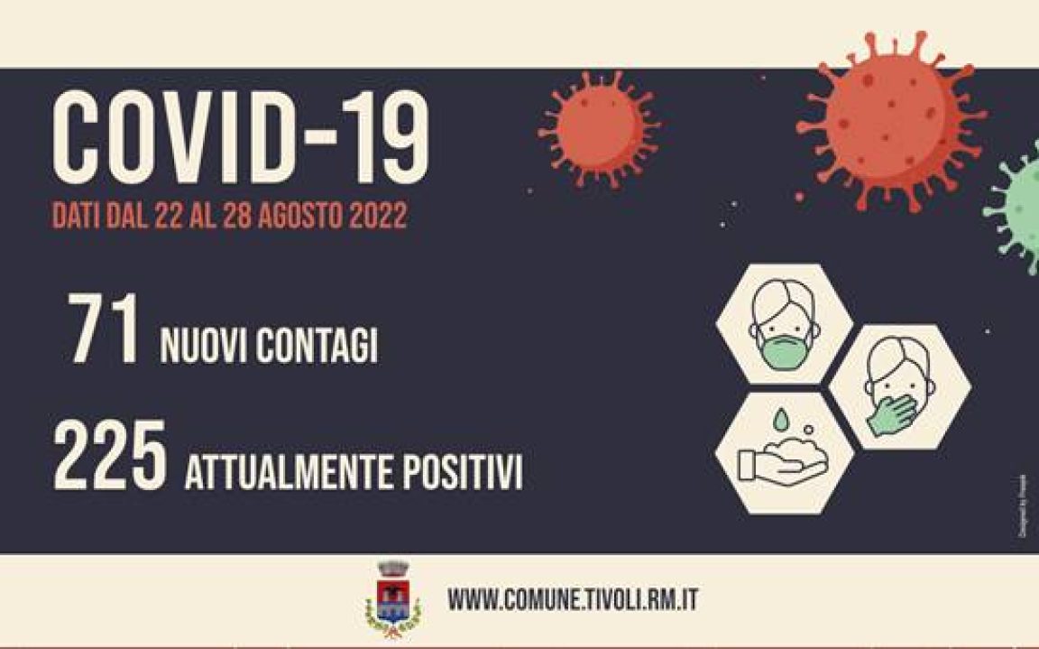 La Asl Roma 5 ha comunicato che da lunedì 22 agosto a domenica 28 agosto, ci sono stati 71 nuovi casi positivi al Covid-19 a Tivoli. Il totale delle persone attualmente positive al Covid-19 nella Città di Tivoli è di 225 (28/08/2022).