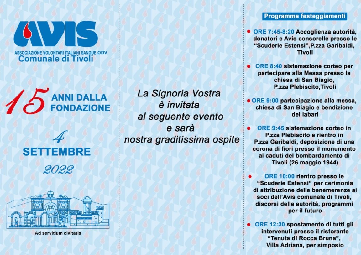 In occasione dei 15 anni dalla Fondazione, l’Avis Comunale di Tivoli organizza, per il giorno 4 settembre, una mattinata di festeggiamenti. Si parte con l’accoglienza delle autorità, dei donatori e delle consorelle presso le Scuderie Estensi per poi proseguire con la messa nella chiesa di San Biagio alle ore 9.00. Prevista anche la cerimonia di attribuzione delle benemerenze ai soci dell’Avis comunale di Tivoli che si siano distinti: c’è anche chi, ad esempio, ha superato le 100 donazioni.