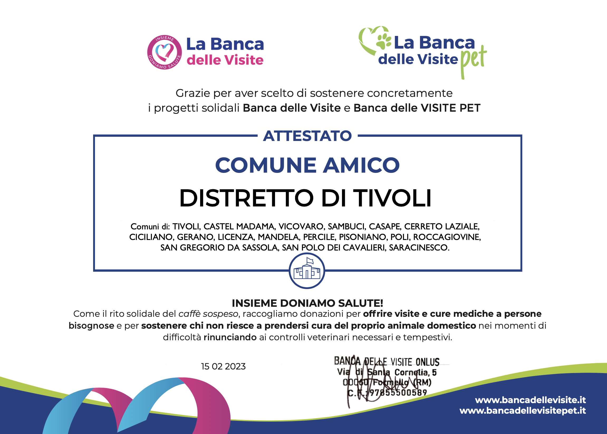 “Quello che chiederemo alle strutture e i professionisti in zona, come tutti i SuperDoc che aderiscono al circuito solidale, sarà la disponibilità a fornire qualche prestazione solidale gratuita e un listino dedicato a costi calmierati” – aggiunge la Presidente di Banca delle Visite Onlus, Michela Dominicis, in occasione della consegna dell’Attestato all’Assessore Cappelli presso il Comune di Tivoli.