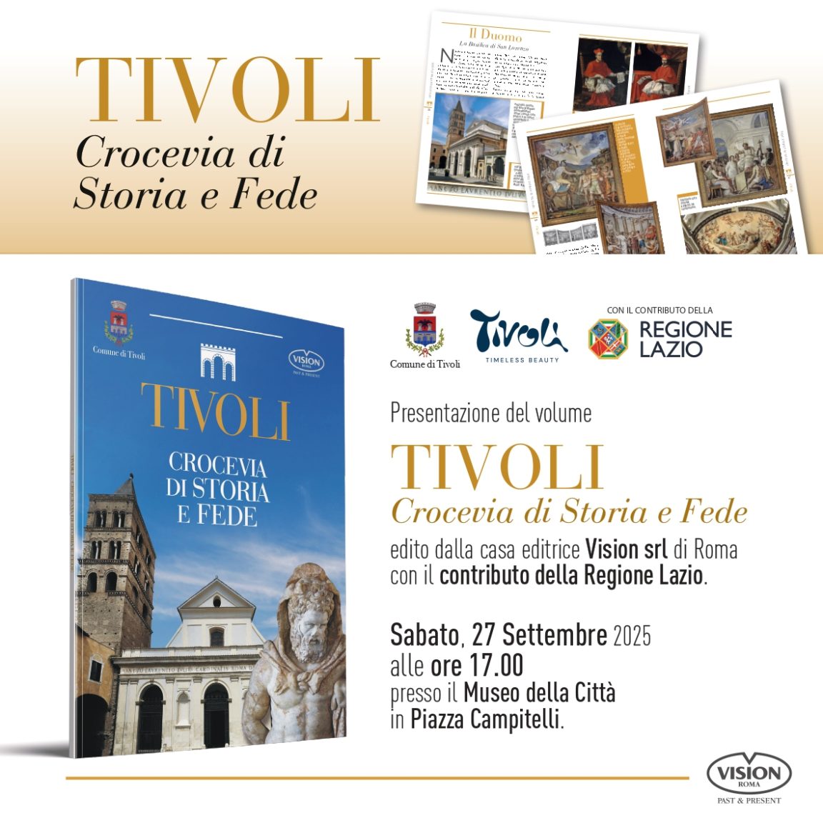 Sabato 27 settembre 2025, alle ore 17:00, nella Sala Conferenze del Museo della Città, sarà presentato il volume “Tivoli. Crocevia di Storia e Fede”, edito dalla Casa Editrice Vision srl con il contributo della Regione Lazio.