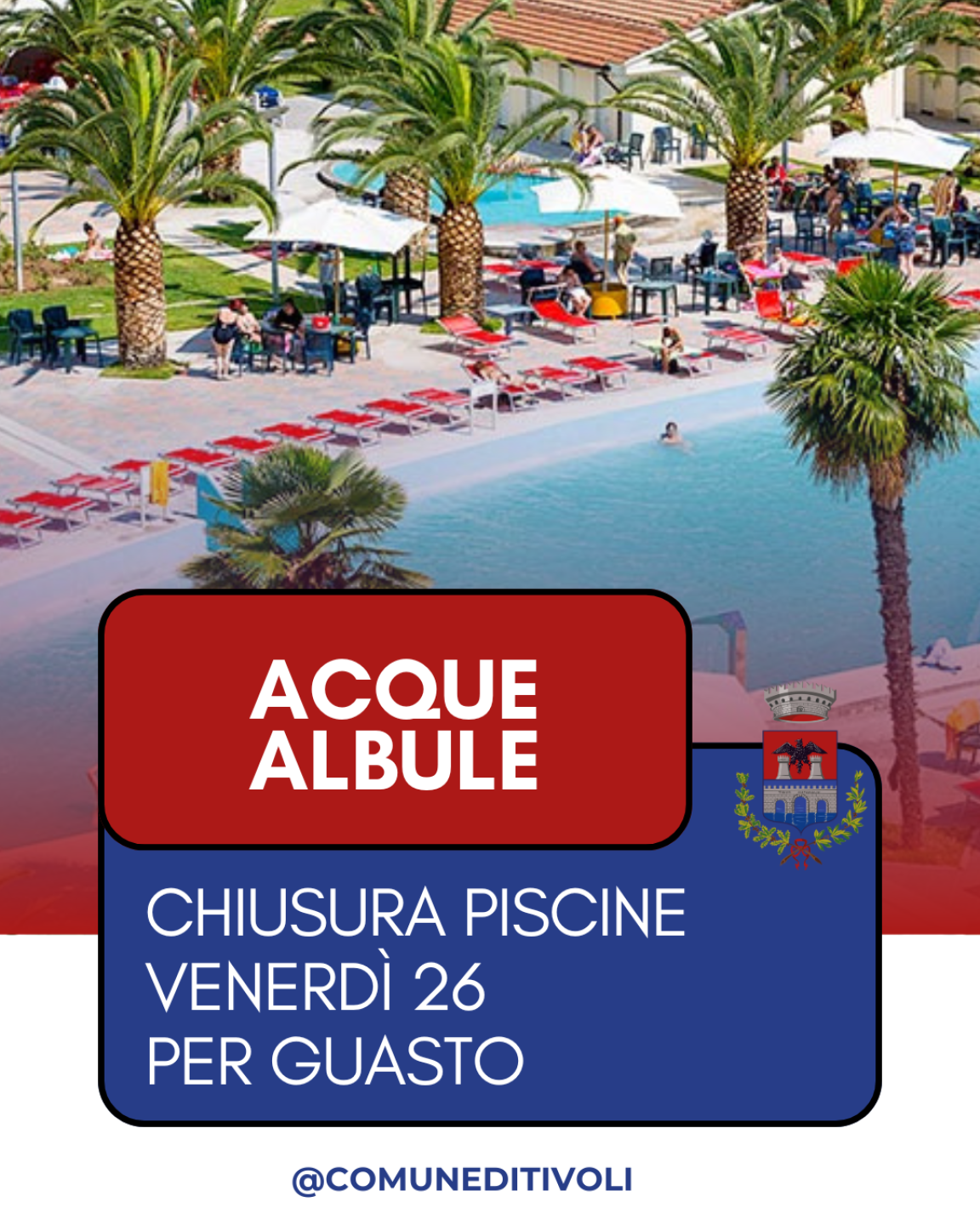 Si informa la cittadinanza che, come comunicato da Acque Albule S.p.A., nella giornata di venerdì 26 settembre le piscine delle Terme resteranno chiuse.