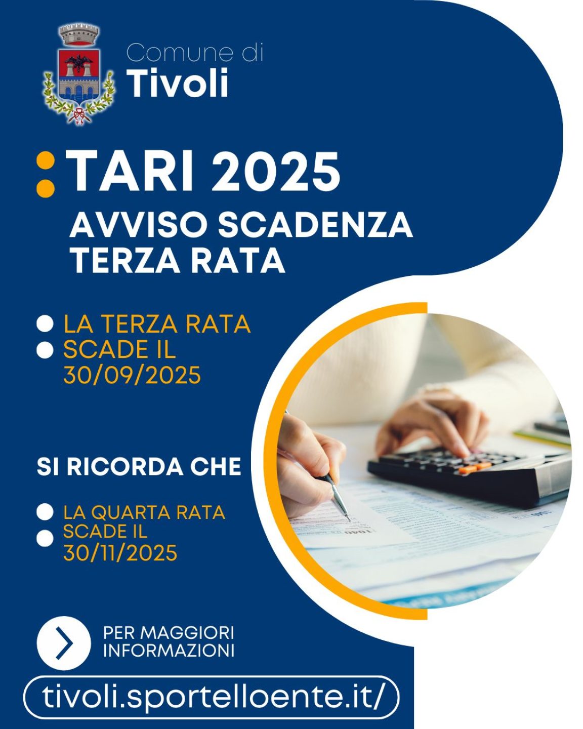 Il Comune di Tivoli ricorda ai cittadini che la scadenza della terza rata della TARI 2025 è il 30 settembre.
