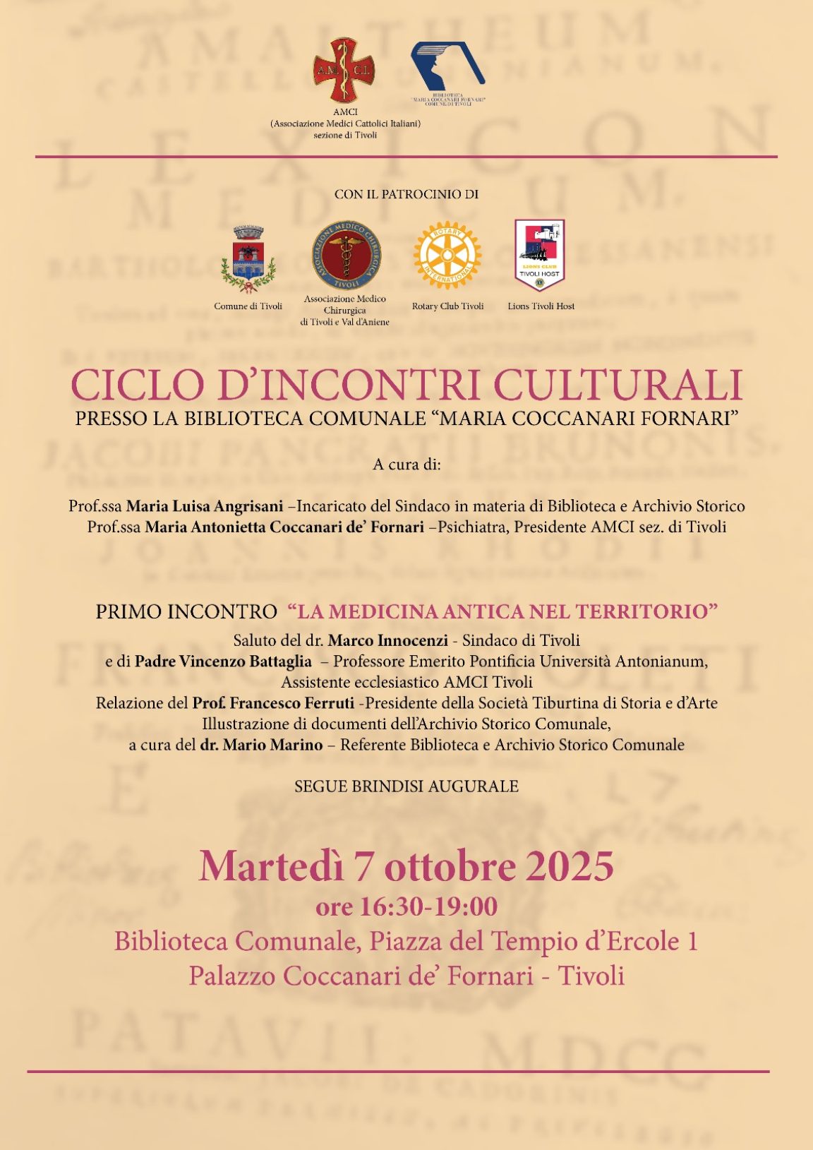 Martedì 7 ottobre 2025, alle ore 16:30, presso la Biblioteca Comunale di Tivoli, avrà inizio un Ciclo d’Incontri Culturali.