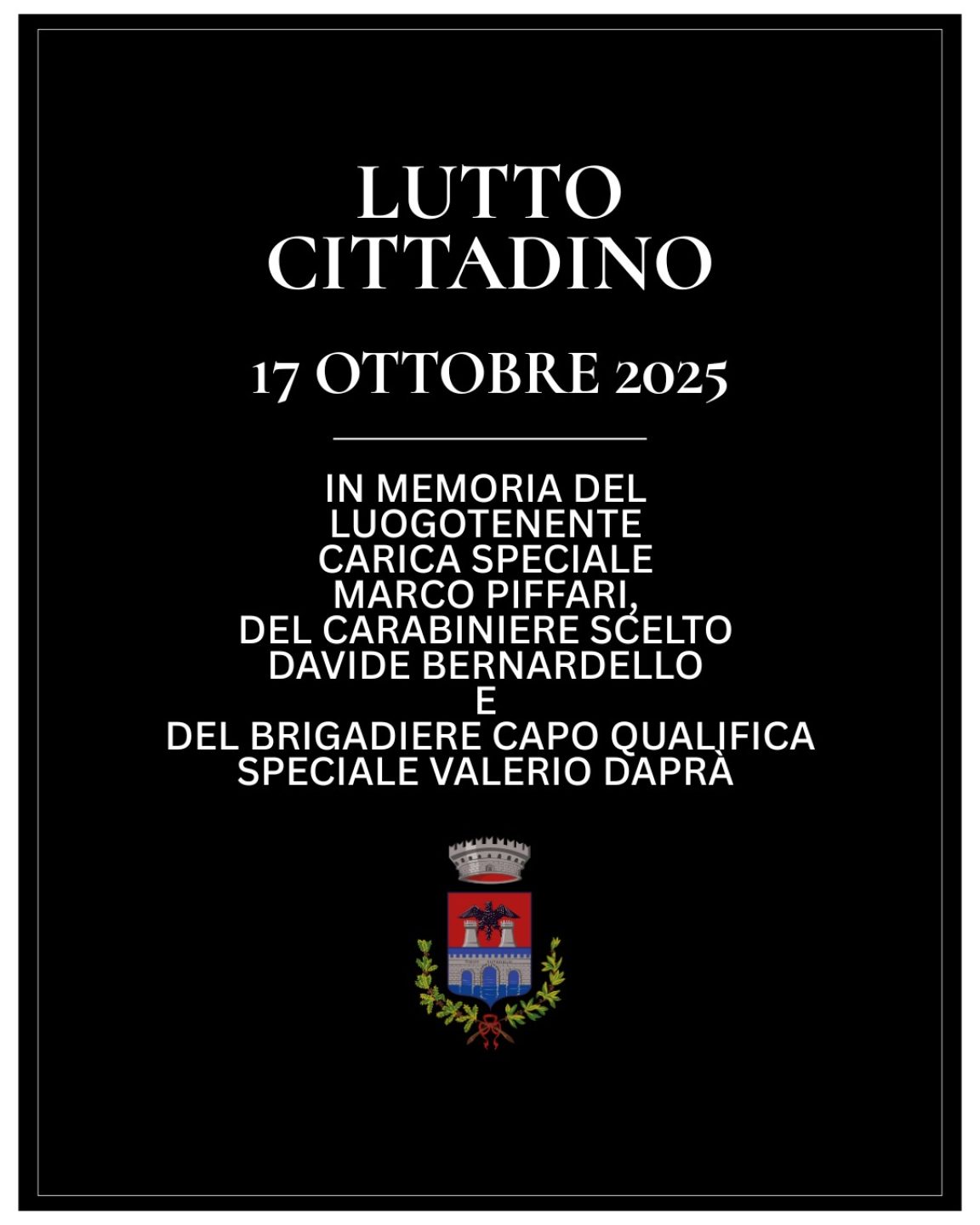 La proclamazione del lutto cittadino rappresenta un atto di partecipazione e vicinanza dell’intera comunità di Tivoli al dolore delle famiglie delle vittime e al rispetto dovuto a tutte le Forze dell’Ordine, che quotidianamente operano al servizio dello Stato e dei Cittadini.