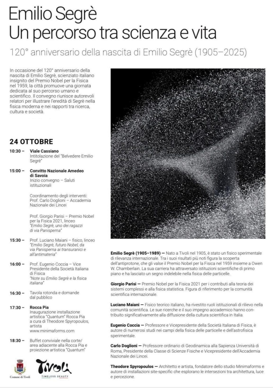 In occasione del 120° anniversario della nascita di Emilio Segrè (1905–2025), illustre cittadino tiburtino e Premio Nobel per la Fisica nel 1959, la Città di Tivoli dedica un articolato programma di iniziative commemorative che intrecciano scienza, arte e memoria.
