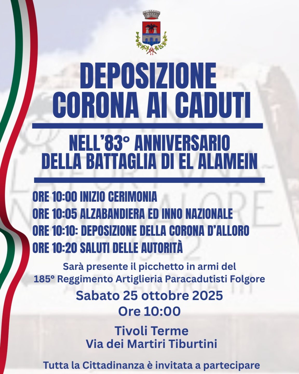 Si invita la cittadinanza a partecipare alla cerimonia di deposizione della corona ai Caduti, in occasione dell’83° anniversario della Battaglia di El Alamein, sabato 25 ottobre 2025 alle ore 10:00 in Via dei Martiri Tiburtini a Tivoli Terme.