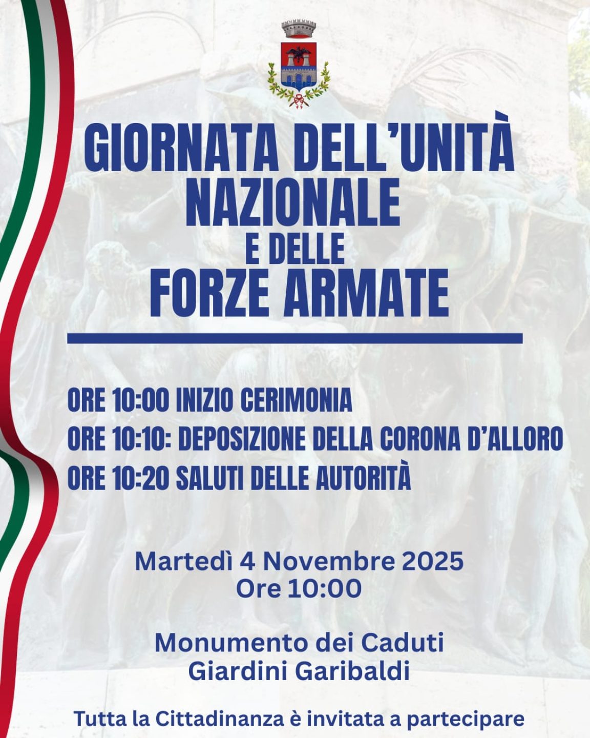 L’Amministrazione Comunale invita la Cittadinanza di Tivoli a partecipare alla Celebrazione della Giornata dell’Unità Nazionale e delle Forze Armate.