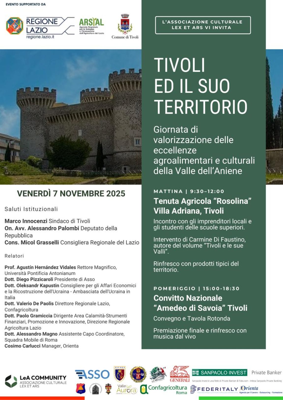 Venerdì 7 novembre 2025 Tivoli ospiterà una giornata interamente dedicata alla conoscenza e alla valorizzazione delle risorse del territorio, promossa dall’Associazione Culturale Lex et Ars con il sostegno della Regione Lazio, di ARSIAL e del Comune di Tivoli.