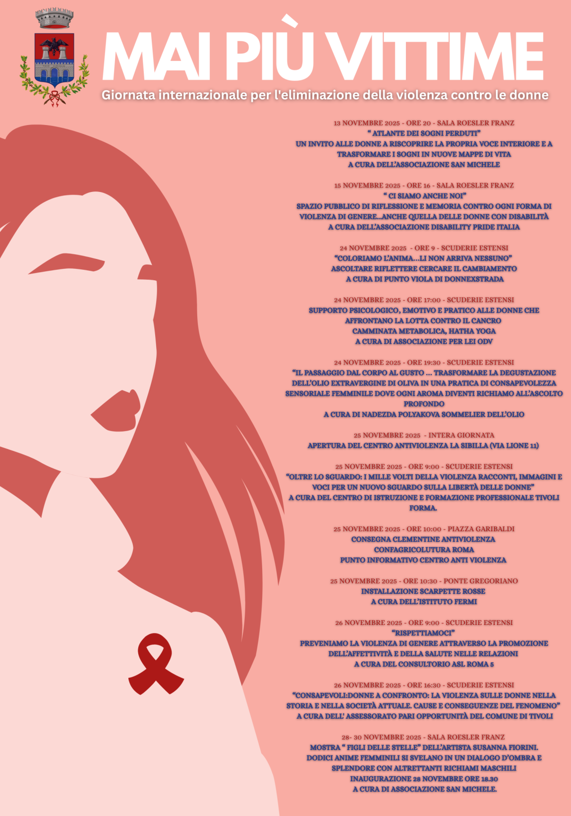 In occasione della Giornata internazionale per l’eliminazione della violenza contro le donne, il Comune di Tivoli ha predisposto un calendario di eventi che coinvolge associazioni, professionisti e realtà del territorio.