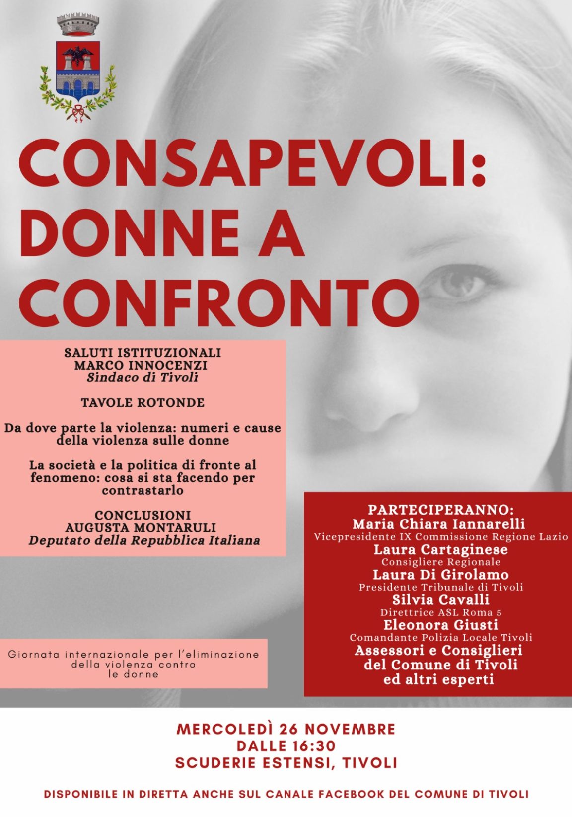 L’Amministrazione comunale invita la Cittadinanza a partecipare al convegno “Consapevoli: donne a confronto”, iniziativa inserita nel programma degli eventi dedicati alla Giornata internazionale per l’eliminazione della violenza contro le donne.