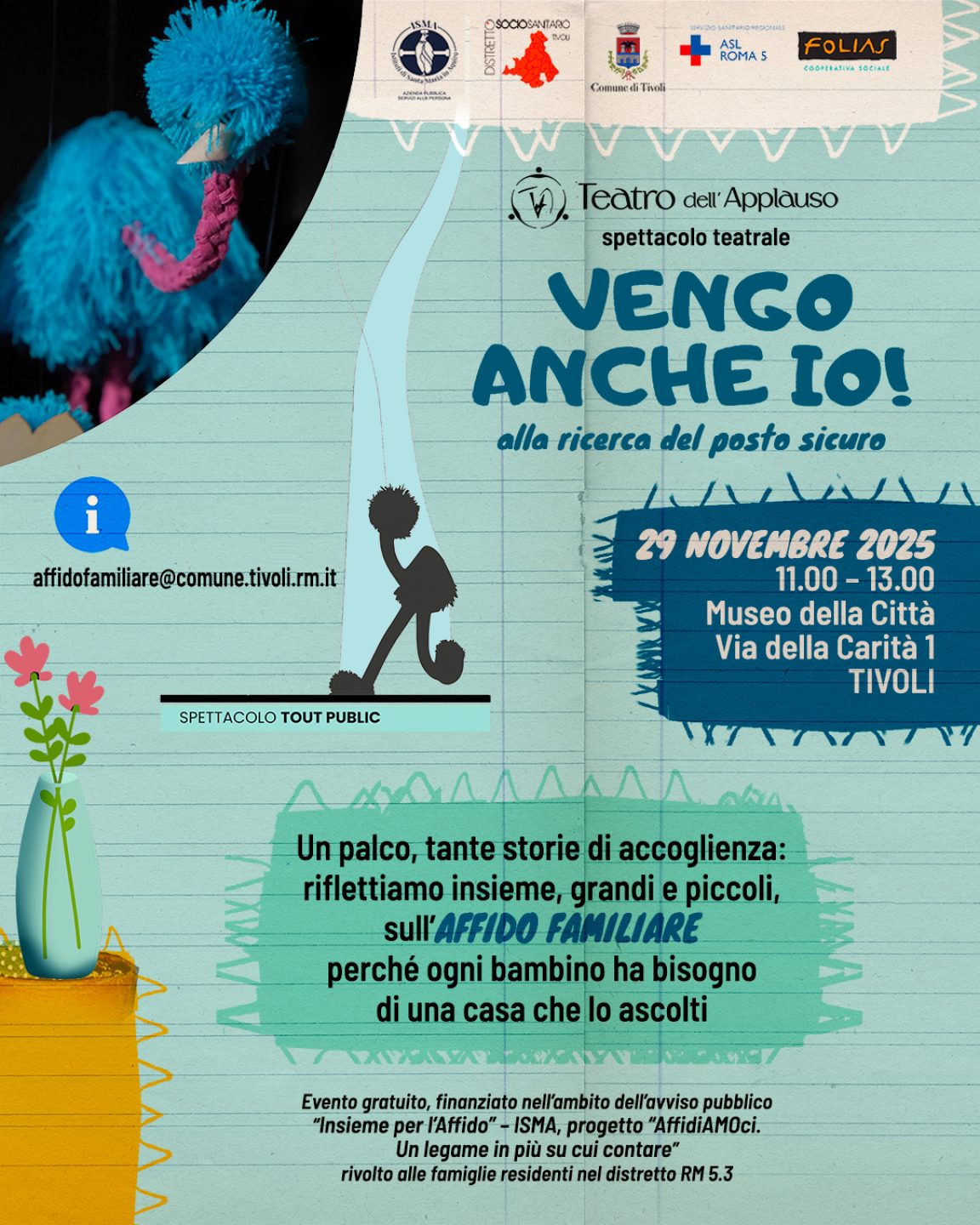 Ci sarà lo spettacolo teatrale “VENGO ANCHE IO! Alla ricerca del posto sicuro”, a cura del Teatro dell’Applauso, che offrirà uno sguardo sensibile e immediato sul valore dell’affido attraverso il linguaggio del teatro.