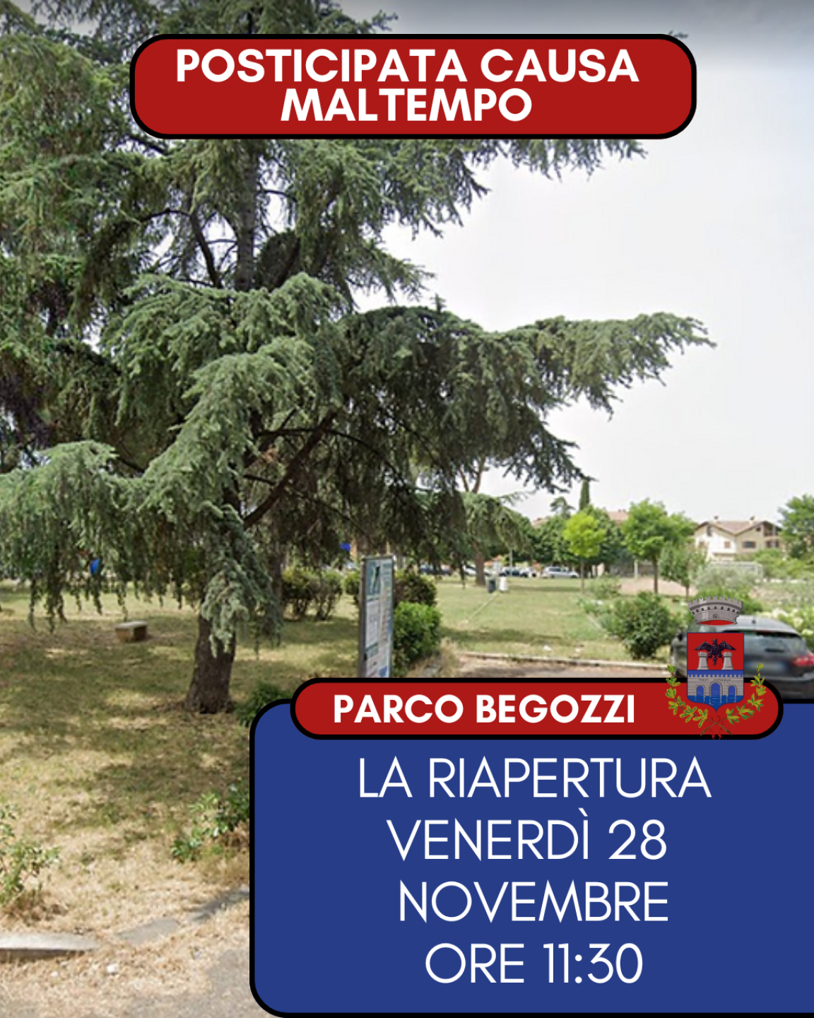 Si informa la Cittadinanza che, a causa delle avverse previsioni meteo, la riapertura di Parco Begozzi è stata rimandata a venerdì 28 novembre, ore 11:30, per consentire l’inaugurazione in condizioni ottimali.