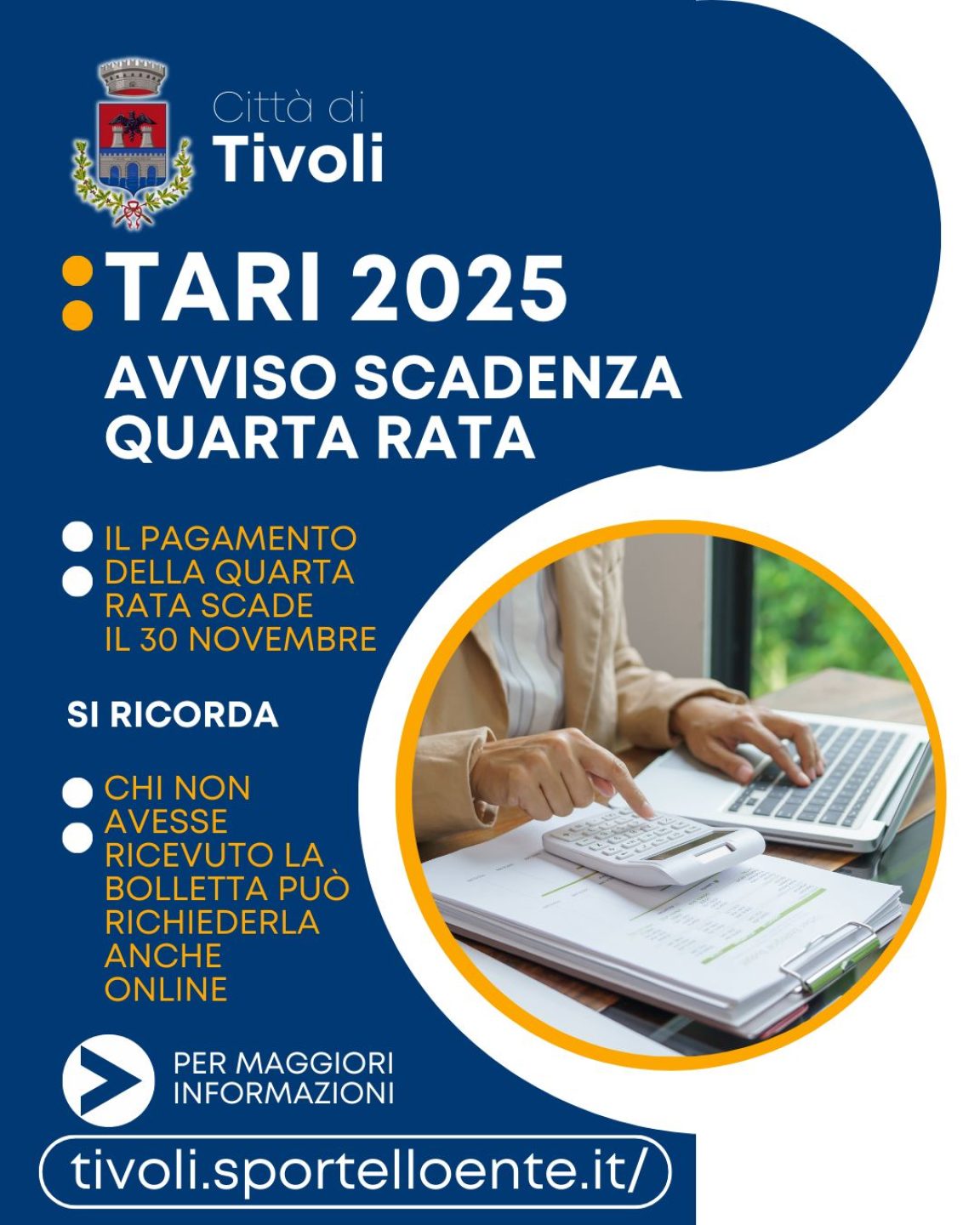 Si informa che il termine per il pagamento della quarta rata della TARI 2025 è fissato al 30 novembre. Si invitano tutti gli utenti a verificare con attenzione la propria documentazione ed effettuare il versamento entro la data prevista, al fine di evitare eventuali solleciti o interessi di mora.