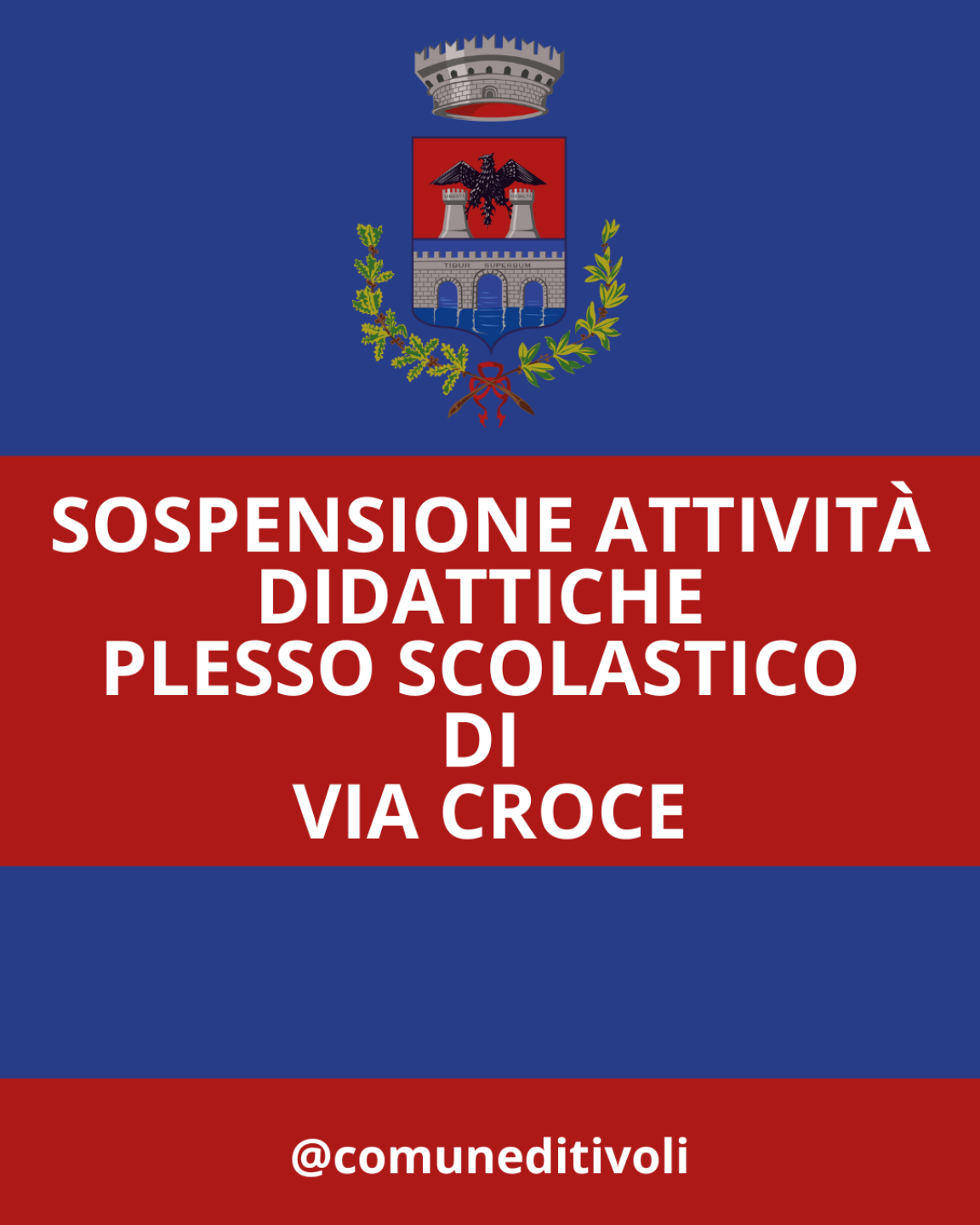 Il Comune di Tivoli informa che, per l’intera giornata di mercoledì 3 dicembre 2025, le attività didattiche del plesso scolastico “Via Croce”, appartenente all’Istituto Comprensivo Tivoli I, saranno sospese a causa di una interruzione programmata dell’energia elettrica che interesserà l’area di Via G. A. Croce.