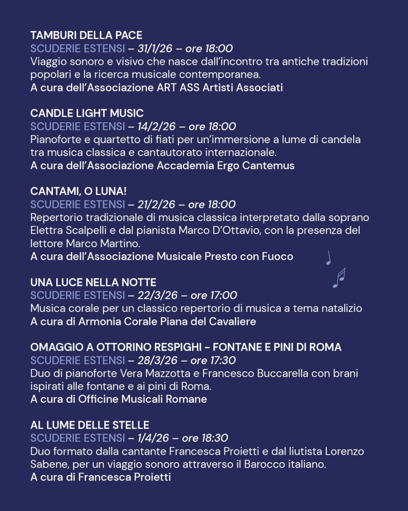 Si apre con Liszt nei luoghi di Liszt, un evento dedicato ai virtuosismi pianistici e cameristici, seguito nella stessa giornata dalla suggestiva Misatango, che unisce sonorità natalizie e atmosfere argentine. Il calendario prosegue con serate ospitate nelle chiese storiche della città, come il concerto in ricordo di Paola, con l’Orchestra “Gli Archi del CDM”, e l’appuntamento dedicato a Giacomo Puccini, un viaggio tra le sue arie più celebri. A gennaio e febbraio le Scuderie Estensi ospitano recital pianistici, incontri sonori tra tradizioni popolari e ricerca contemporanea, esibizioni dedicate al canto lirico.