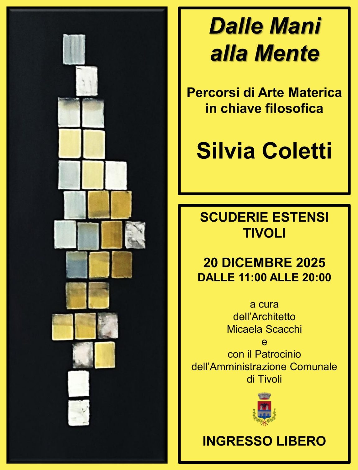 “Dalle Mani alla Mente” porta a Tivoli l’Arte Materica con acrilico, gesso, tessere di mosaico, vetro, rame ed elementi naturali essiccati. Questi materiali trasformano la superficie in un paesaggio tridimensionale.