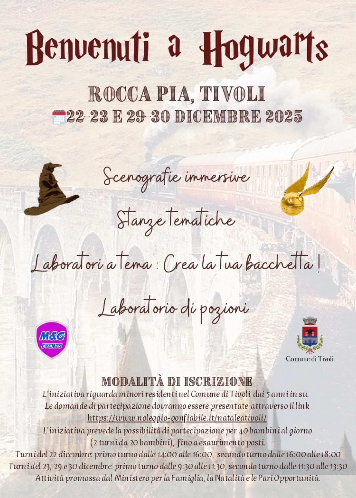 La magia di Hogwarts torna a Tivoli per le festività natalizie. La Rocca Pia si trasforma in una scuola di stregoneria, pronta ad accogliere giovani maghi e streghe, per vivere insieme stanze tematiche e laboratori magici.