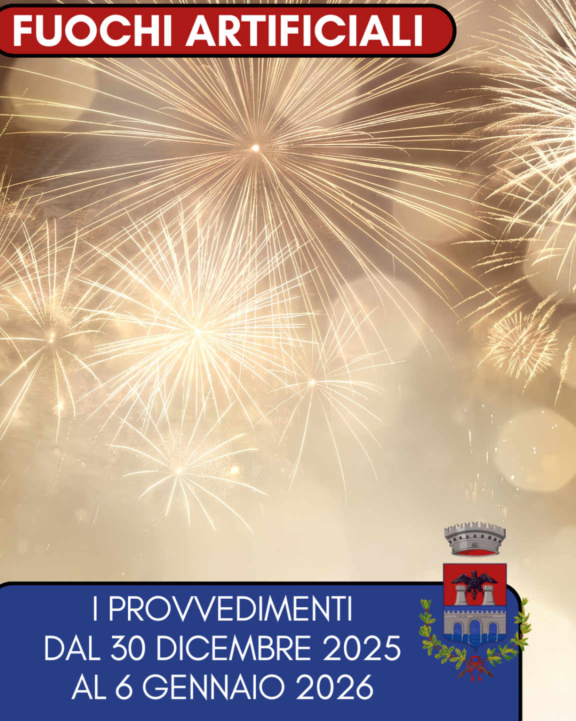 Si informa la cittadinanza che sono stati adottati specifici provvedimenti in materia di utilizzo e vendita di fuochi d’artificio e materiali pirotecnici in occasione delle festività di Capodanno.
