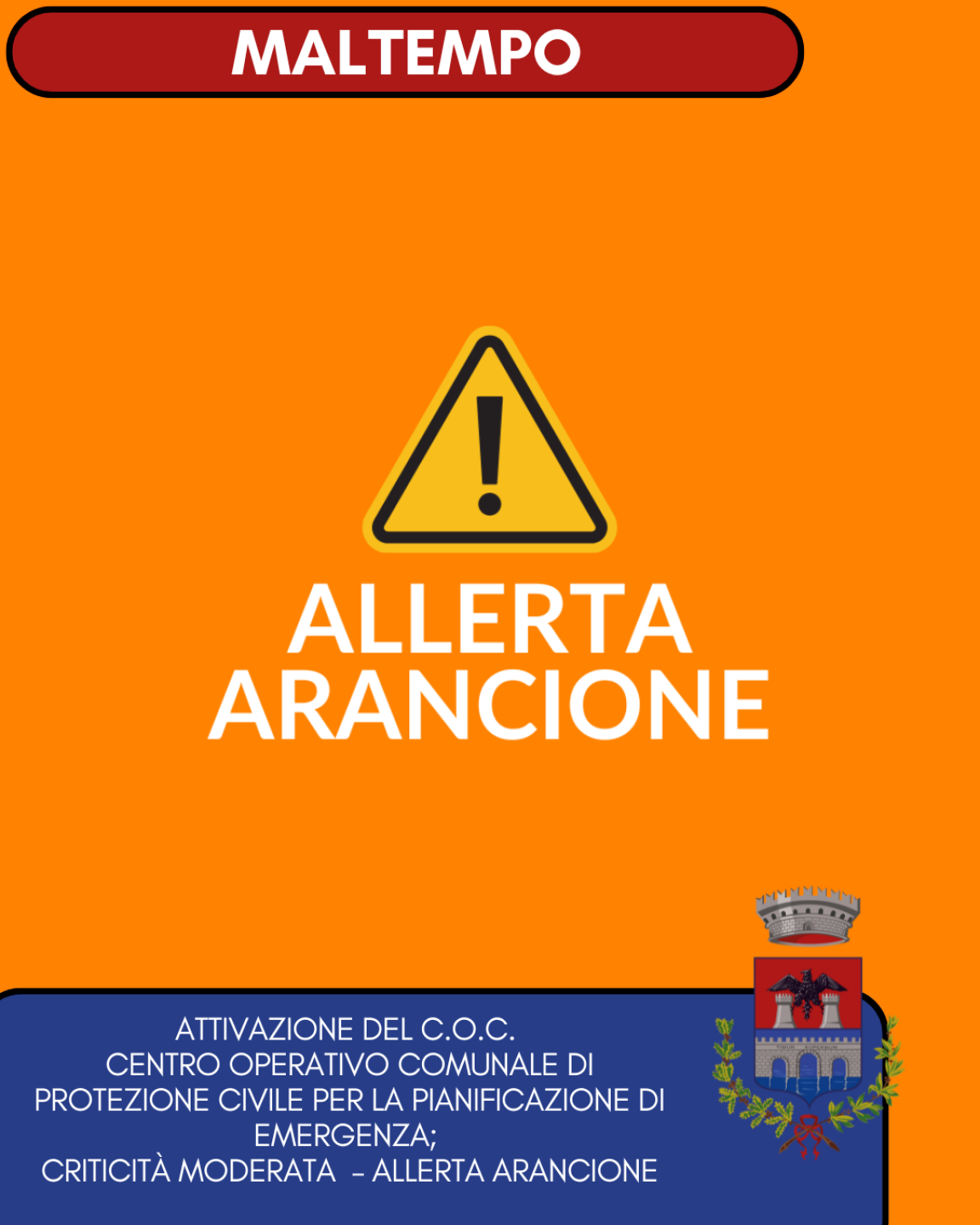 ATTIVAZIONE DEL C.O.C. CENTRO OPERATIVO COMUNALE DI PROTEZIONE CIVILE PER LA PIANIFICAZIONE DI EMERGENZA; CRITICITÀ MODERATA – ALLERTA ARANCIONE