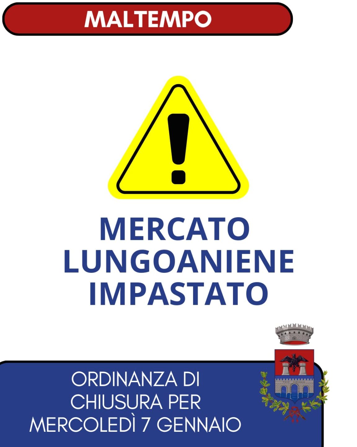 Il mercato settimanale di Lungoaniene Impastato non si svolgerà domani, mercoledì 7 gennaio 2026, per effetto di un’ordinanza del Sindaco adottata in via precauzionale a tutela della sicurezza di Cittadini e operatori, a seguito dell’allerta arancione.