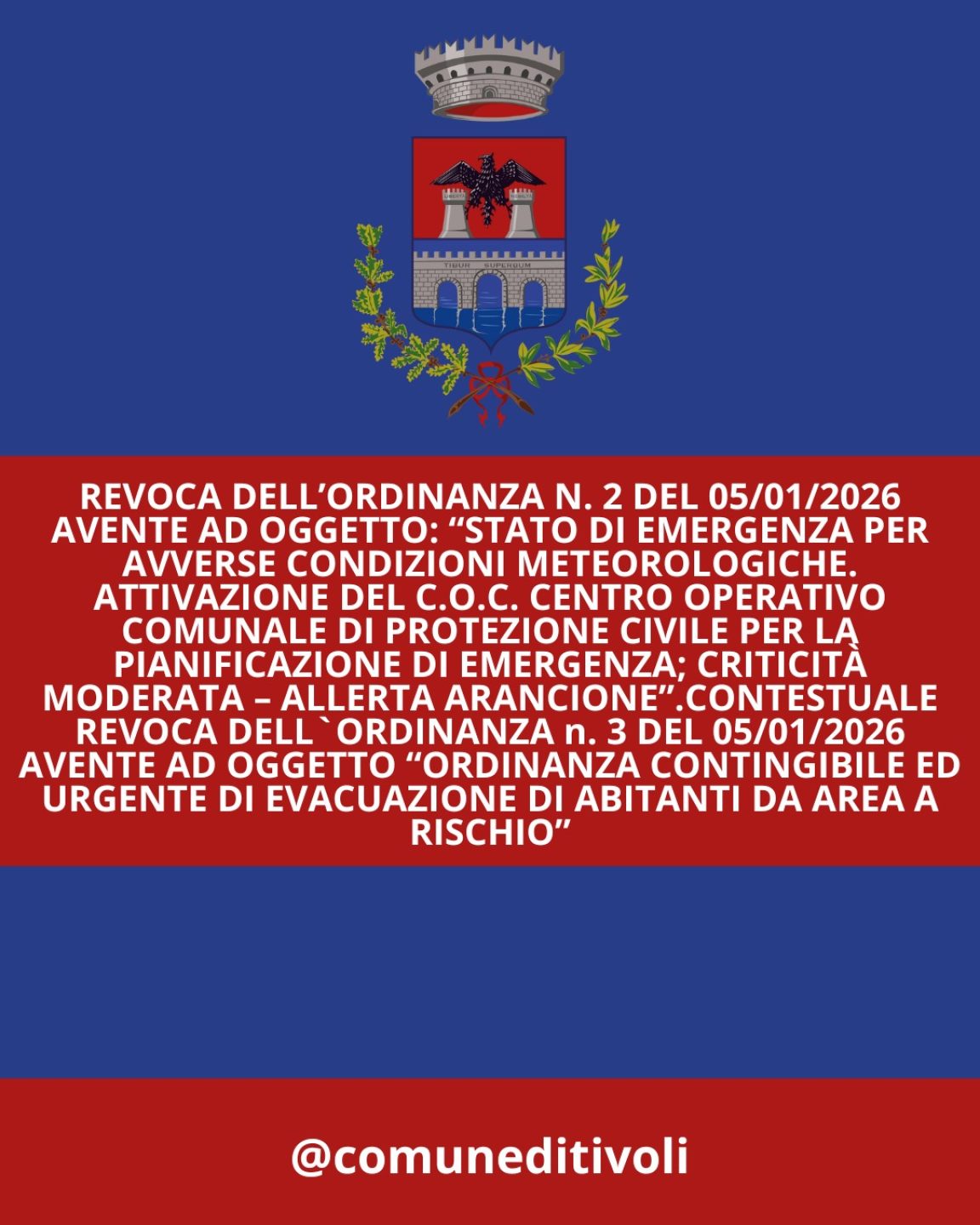 Le ordinanze revocate erano state emesse in ragione della criticità con allerta arancione per rischio idraulico, che aveva determinato l’attivazione del Centro Operativo Comunale (C.O.C.) e l’evacuazione preventiva dei residenti nell’area di Tivoli Terme, limitatamente alle vie Vincenzo Bellini, Giuseppe Verdi (lato destro dai civici 40 al 80 incluso e lato sinistro dai civici 31 al 49 incluso), Domenico Scarlatti e Largo Benedetti. Il successivo bollettino del Dipartimento di Protezione Civile del 6 gennaio aveva elevato l’allerta a livello rosso. Nei giorni successivi, l’evoluzione positiva della situazione metereologica ha fatto venire meno ogni condizione di pericolo, rendendo superate le misure contingibili e urgenti.