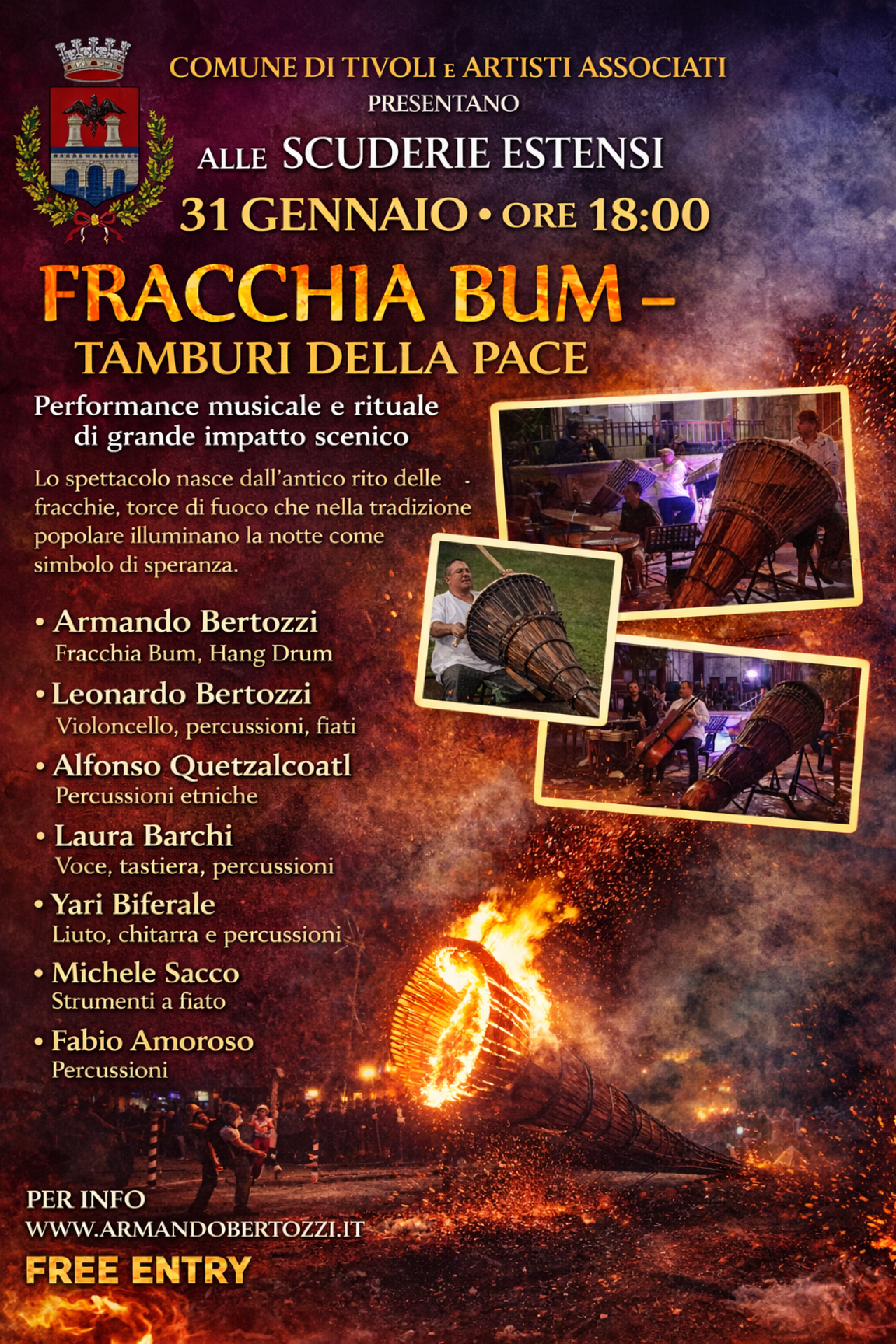 Ideato e diretto da Armando Bertozzi, Fracchia Bum – Tamburi della Pace è un concerto che unisce percussioni rituali, strumenti a corda, fiati e voce, dando vita a un’esperienza artistica intensa, capace di coinvolgere il pubblico a livello sensoriale e simbolico. La musica diventa linguaggio universale, veicolo di dialogo e messaggio di pace.