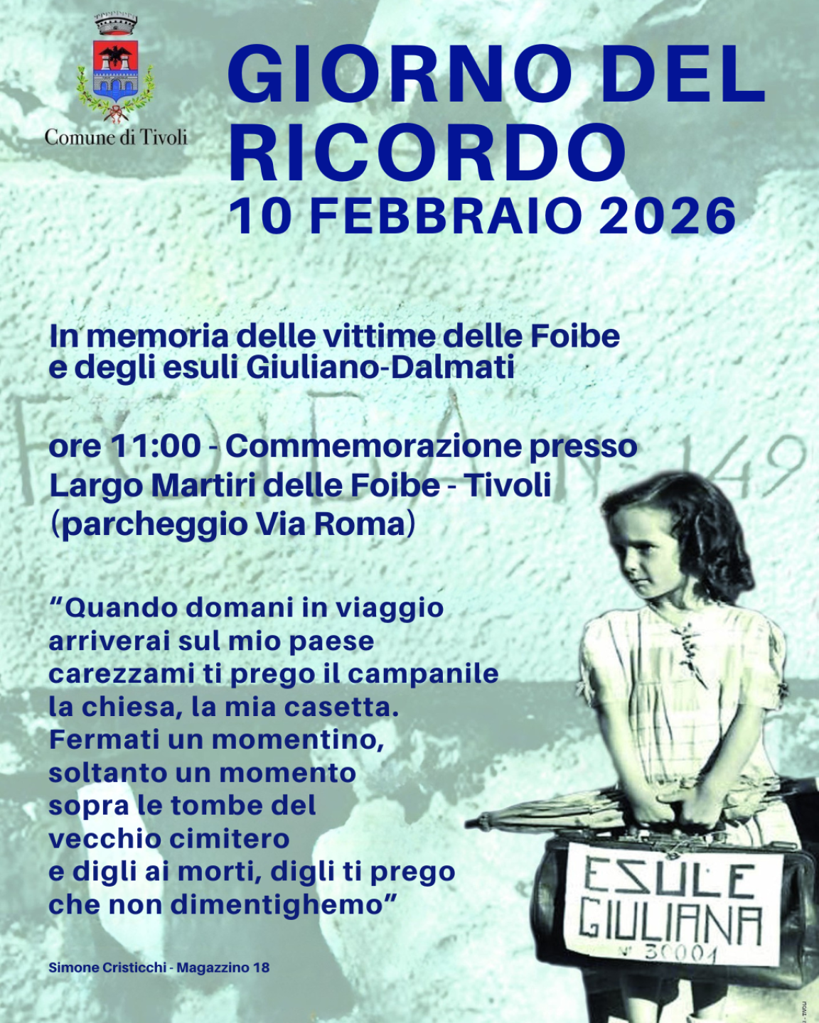 Si invita la cittadinanza a partecipare alla commemorazione del Giorno del Ricordo, che si svolgerà martedì 10 febbraio 2026 alle ore 11:00, presso Largo Martiri delle Foibe (parcheggio Via Roma), Tivoli.