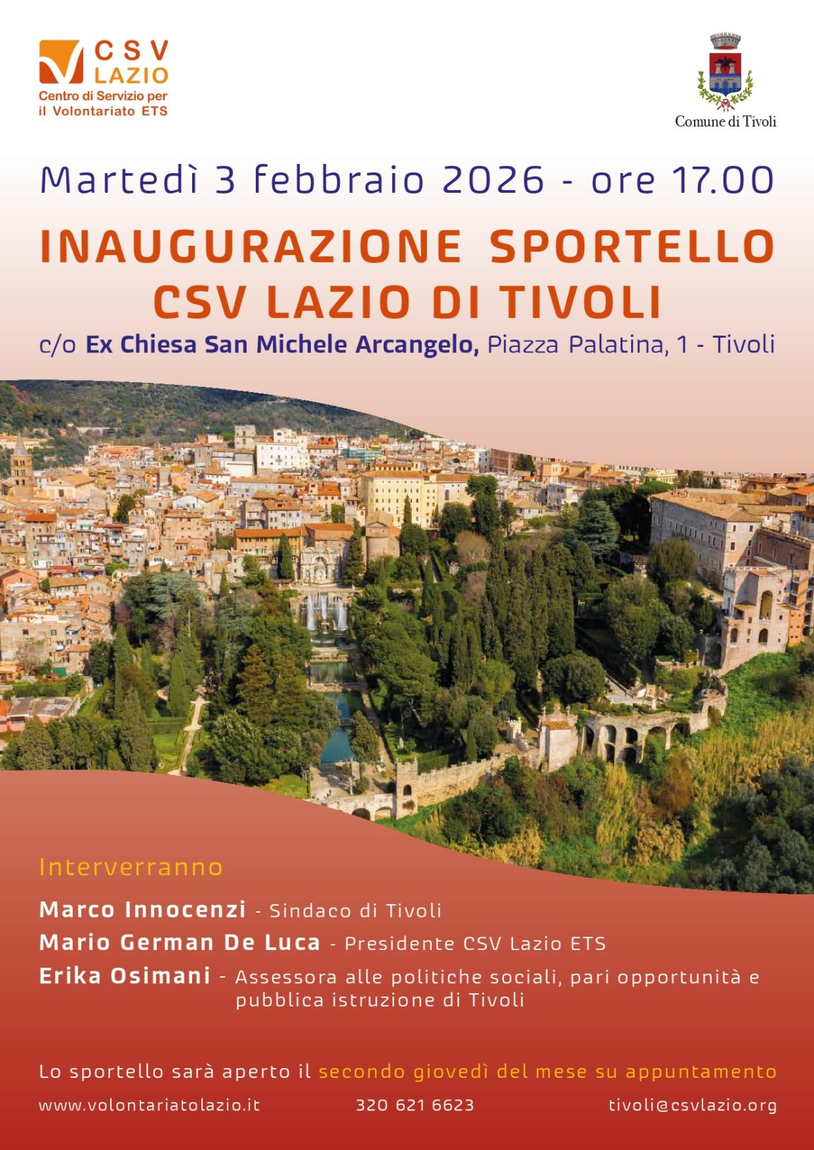 Per informazioni è possibile contattare il numero 320 621 6623 e l’indirizzo email: tivoli@csvlazio.org.