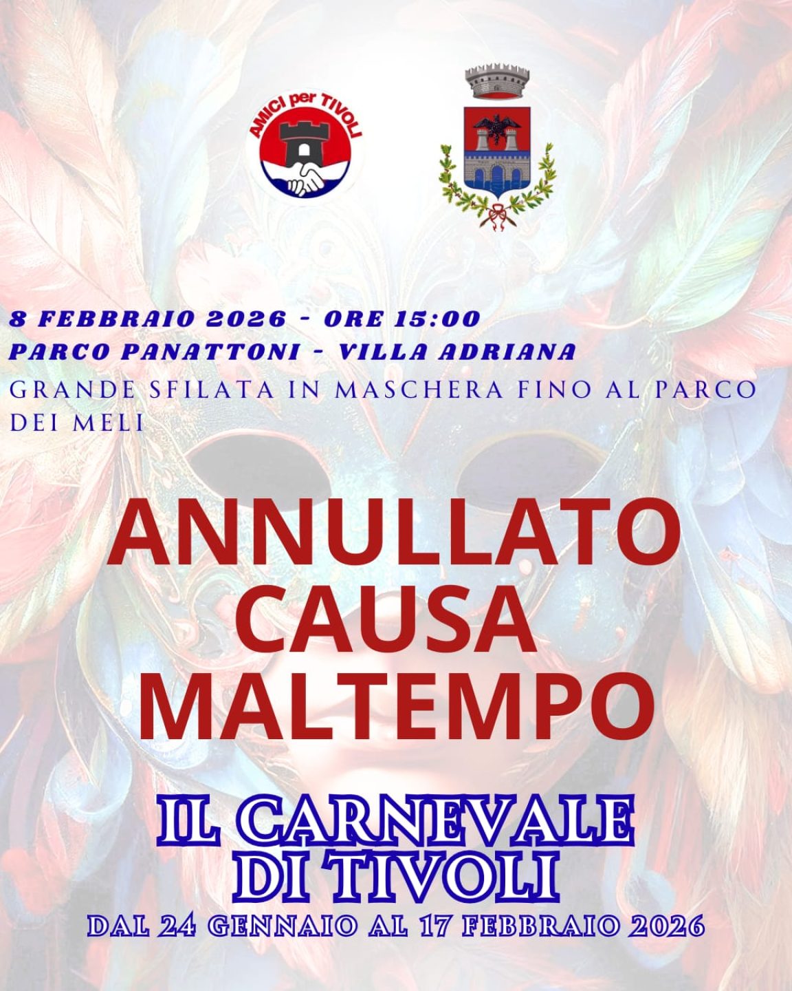 Si informa la cittadinanza che, a causa delle avverse condizioni meteo che impedirebbero lo svolgimento in condizioni di piena sicurezza, la sfilata in maschera prevista per la giornata di oggi è annullata.