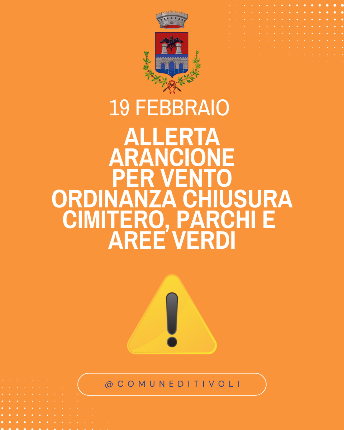 A causa delle avverse condizioni metereologiche, è in corso di adozione l’ordinanza sindacale che disporrà il divieto di accesso ai parchi pubblici e alle aree verdi comunali nonché la chiusura del civico cimitero per il giorno giovedì 19 febbraio.
