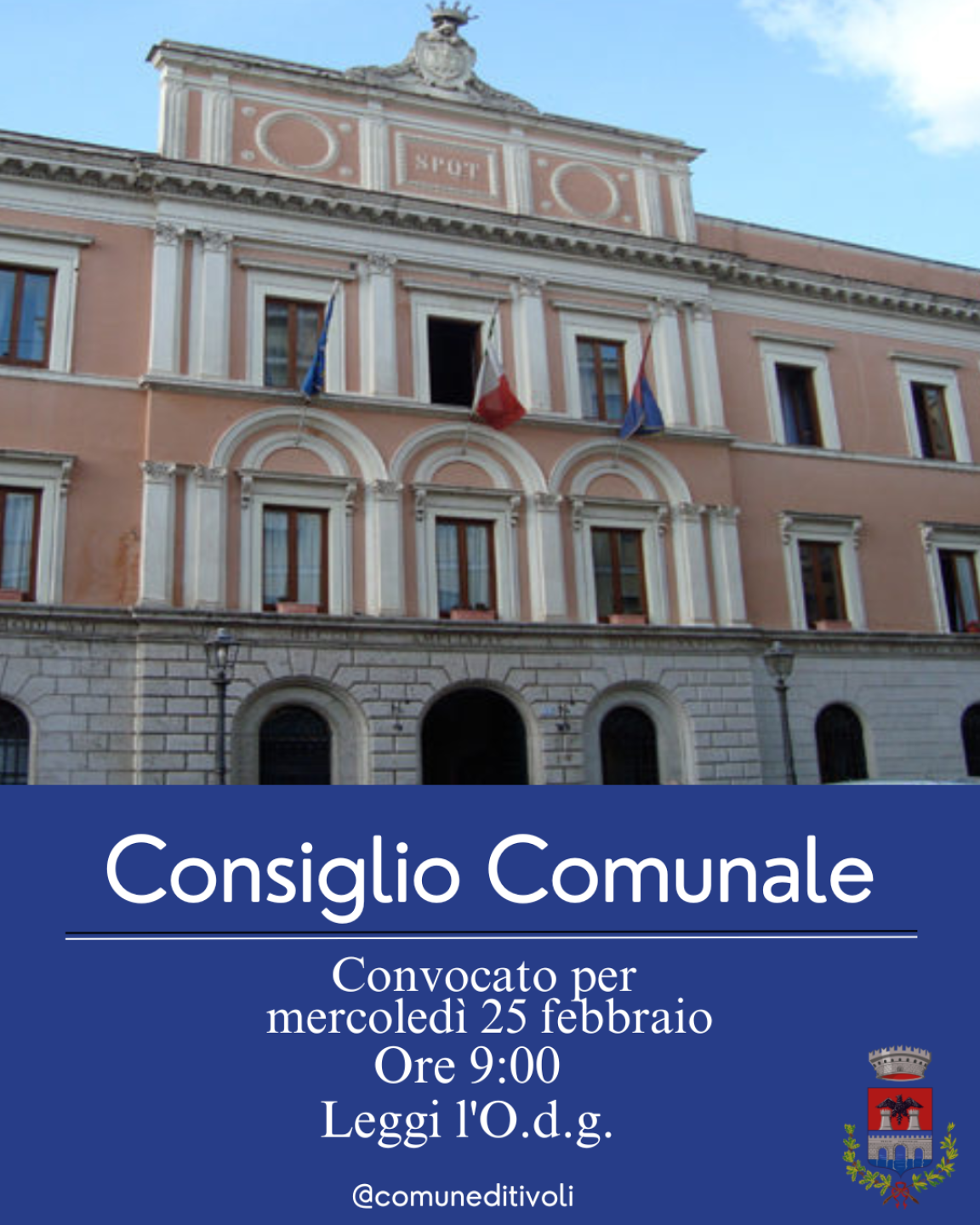 Il Consiglio Comunale del Comune di Tivoli è convocato in seduta straordinaria per il 25 febbraio 2026 alle ore 9.00, presso la sede comunale.