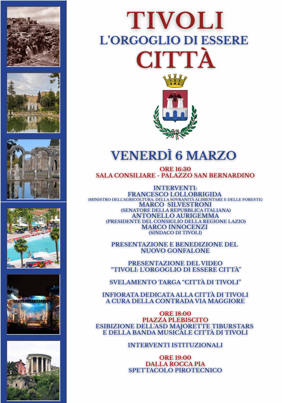È disponibile il programma dettagliato di “Tivoli – L’orgoglio di essere Città”, la giornata con cui celebriamo ufficialmente il prestigioso titolo conferito dal Presidente della Repubblica.