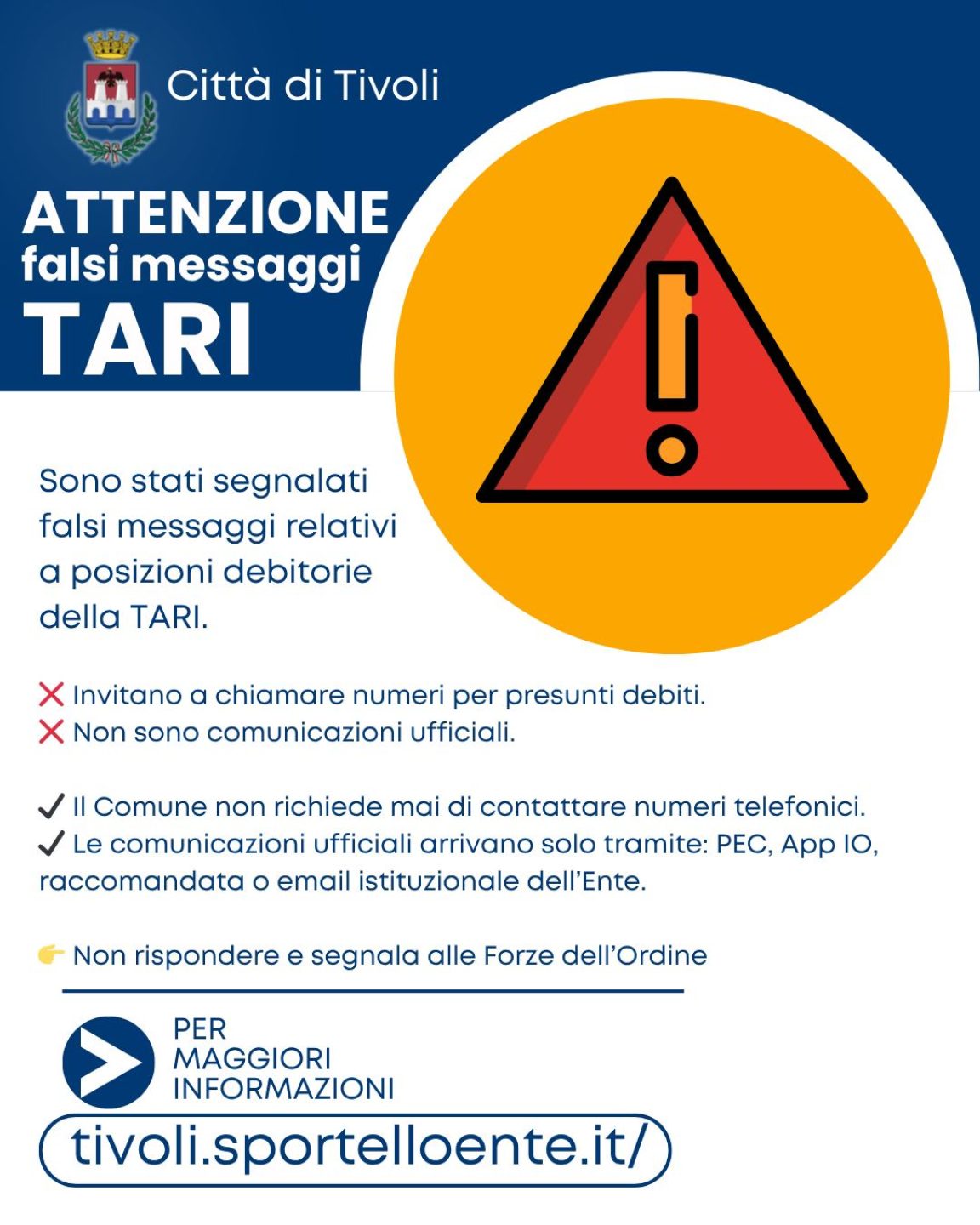 La Città di Tivoli ricorda che non vengono inviati sms per segnalare eventuali situazioni critiche, né richiede contatti telefonici per la gestione delle posizioni degli utenti. Le comunicazioni ufficiali avvengono esclusivamente tramite i canali ufficiali (portale/sito, telefono, email o sportello).