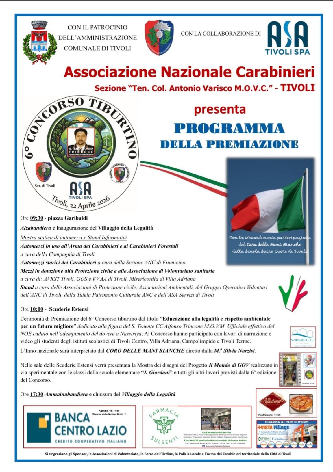 L’evento si inserisce nel contesto del VI° Concorso Tiburtino, realizzato in collaborazione con Asa spa, per sensibilizzare alla gestione consapevole dei rifiuti e al rispetto per la natura. Quest’anno l’edizione sarà dedicata alla memoria del sottotenente Alfonso Trincone, Medaglia d’Oro al Valor Militare, caduto nell’attentato di Nassiriya: presenti i familiari ed il comandante del NOE, ten. col. Fabrizio Massimi.