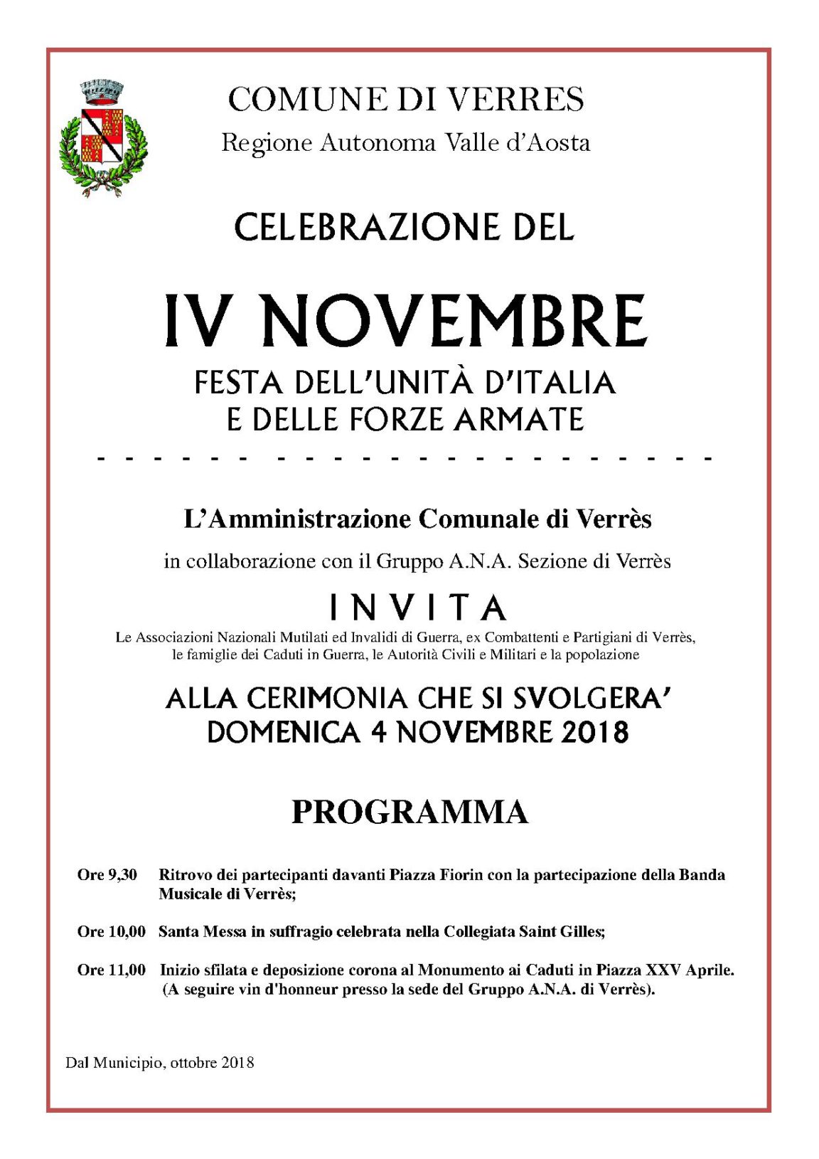 Dopo la Santa Messa officiata nella Collegiata “Saint Gilles”, il Gruppo A.N.A. di Verrès, accompagnati dalle autorità civili e militari e dalla Filarmonica di Verrès, depositerà una corona d’alloro ai Monumento ai Caduti, in piazza XXV Aprile.