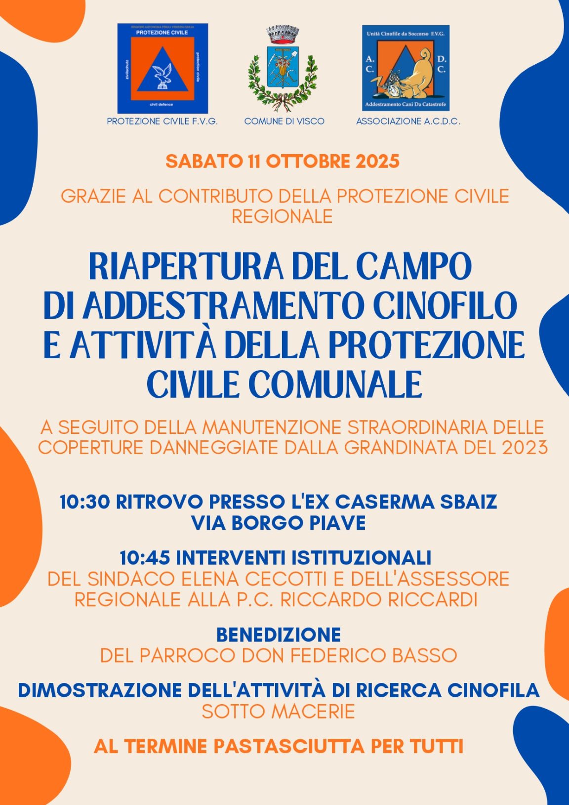 Si comunica la riapertura del campo di addestramento cinofilo e attività della protezione civile comunale a seguito della manutenzione straordinaria delle coperture danneggiate dalla grandinata del 2023 con ritrovo sabato 11 ottobre alle 10:30 preso l’ex caserma Sbaiz in via Borgo Piave, Visco.