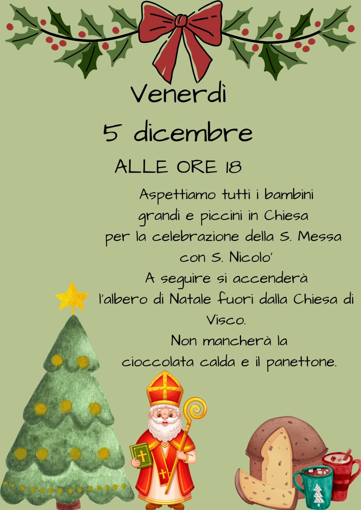 Aspettiamo tutti i bambini in Chiesa per la celebrazione della S. Messa con San Nicolò; a seguire si accenderà l’albero di Natale, non mancheranno cioccolata calda e panettone.